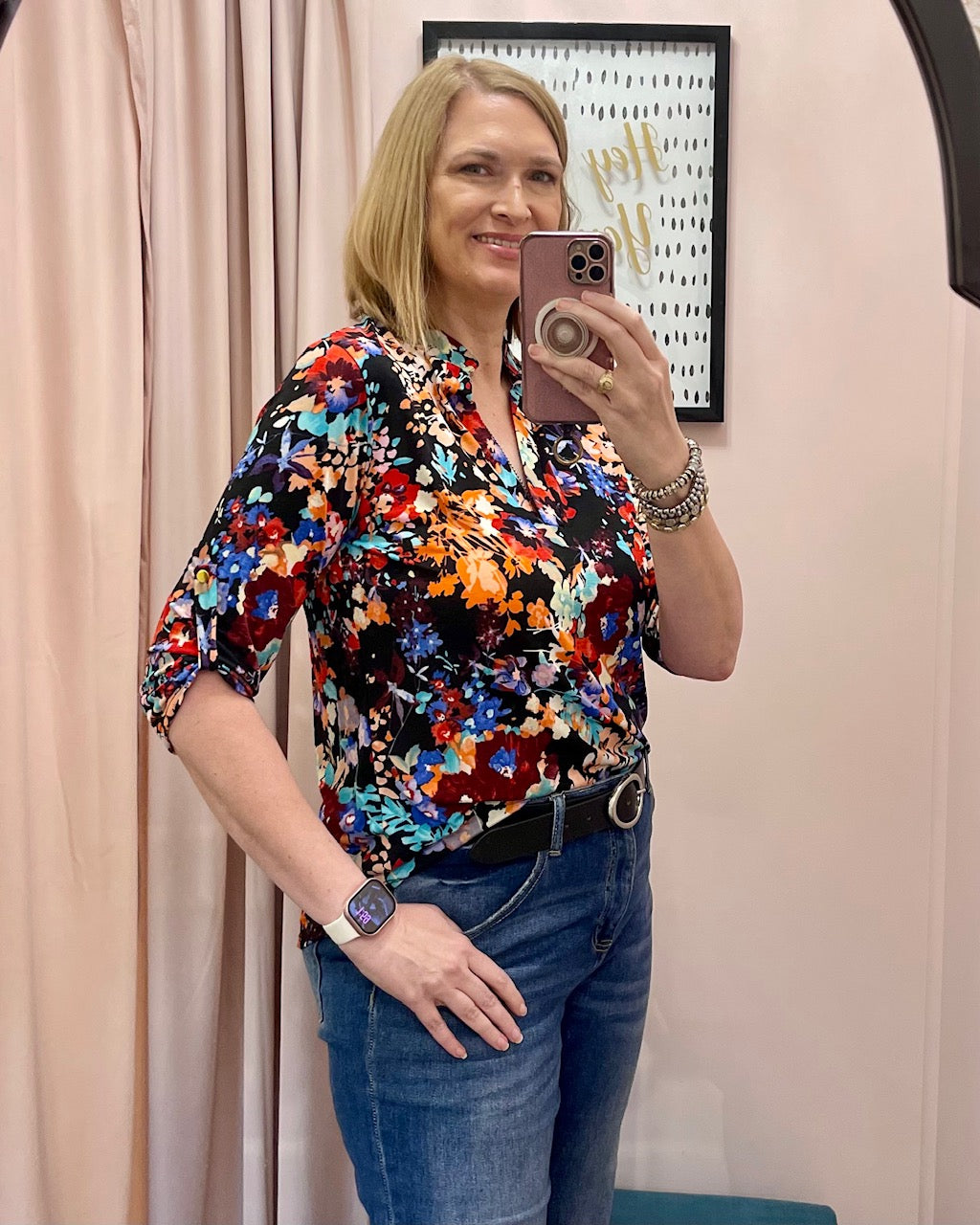 A floral favorite with all-day polish, the Mandarin Bloom Top features a flattering mandarin collar, 3/4 roll-tab sleeves, and a relaxed silhouette in a wrinkle-resistant, travel-friendly fabric. The soft floral print adds a touch of charm, while the lightweight stretch blend (95% polyester, 5% spandex) keeps things effortlessly comfortable.