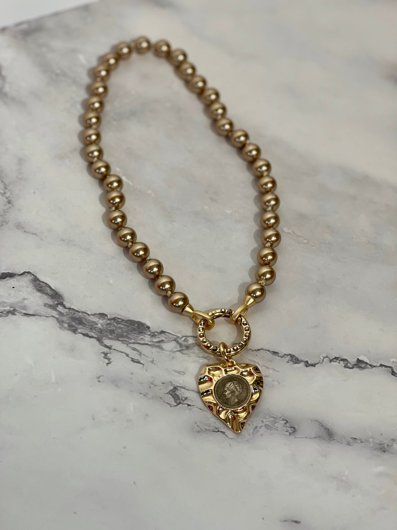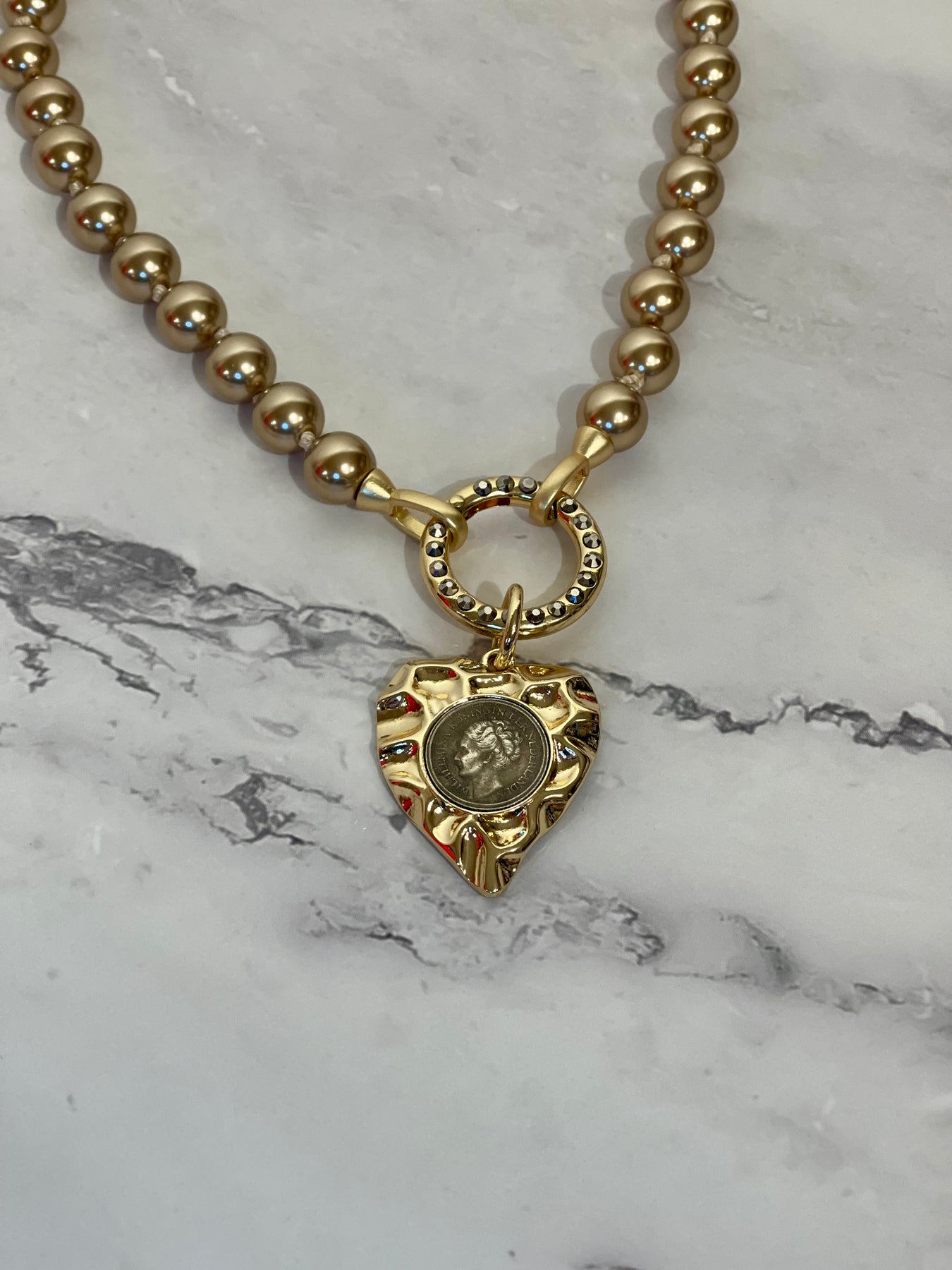 Rich in symbolism and history, the Wilhelmina Heirloom Heart Necklace blends strength, legacy, and timeless design. At its center, a hammered gold-tone heart frames a 1945 replica coin of Queen Wilhelmina of the Netherlands — a remarkable woman remembered for her resilience, leadership, and legacy as one of the most influential figures of her time.