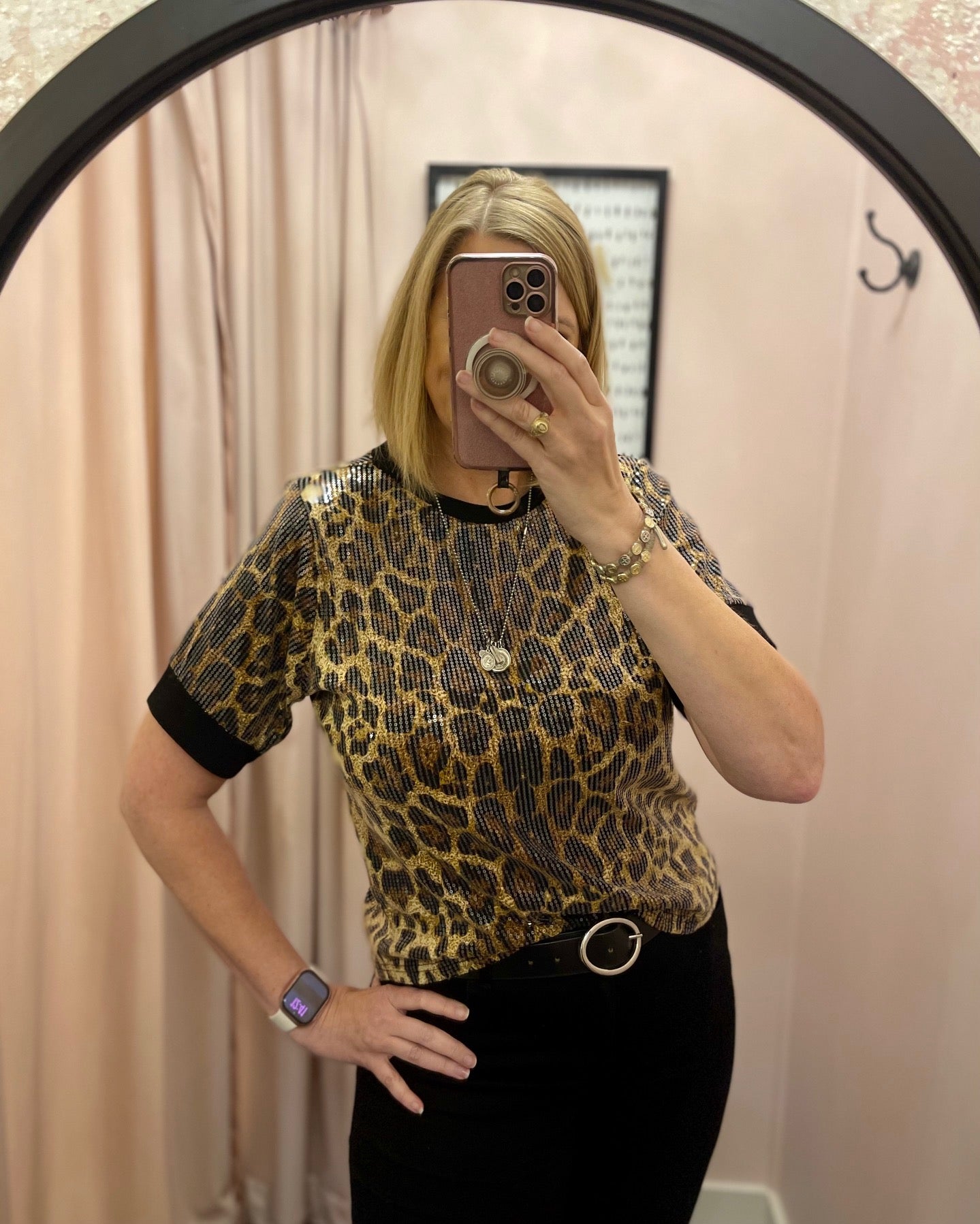 Elevate your wardrobe with this Wild Luxe Sequin Top, featuring an eye-catching leopard sequin design that captures light with every movement. The sophisticated short sleeves are complemented by a refined crew neckline and ribbed cuffs in contrasting fabric, creating a polished silhouette perfect for evening occasions or statement-making everyday wear. Crafted from a luxurious polyester-spandex blend with cotton-rich ribbed accents, this top offers both comfort and durability. Available in sizes S to 3X with a flattering 22½" length, it's an versatile piece that transitions seamlessly from casual to dressy.