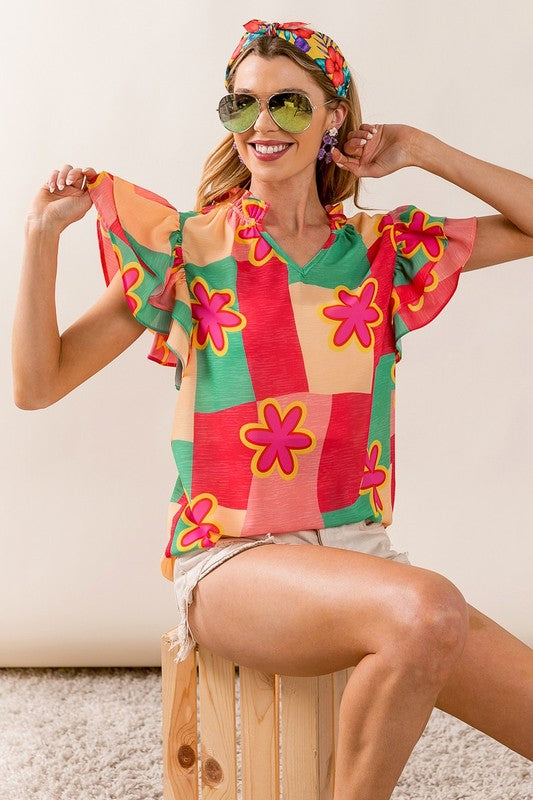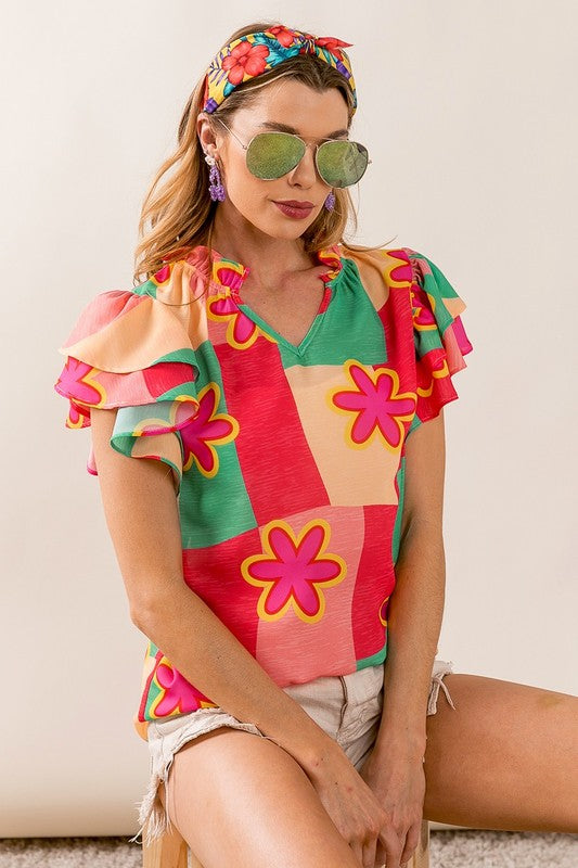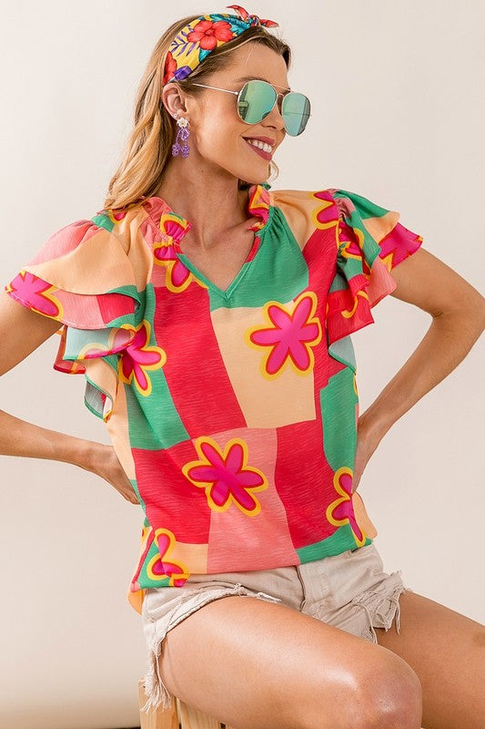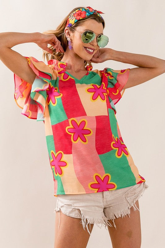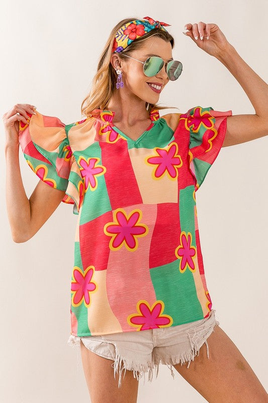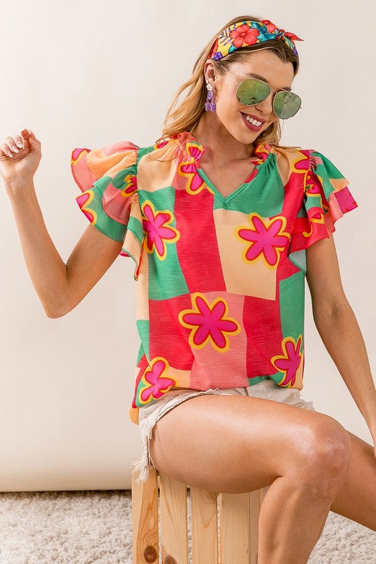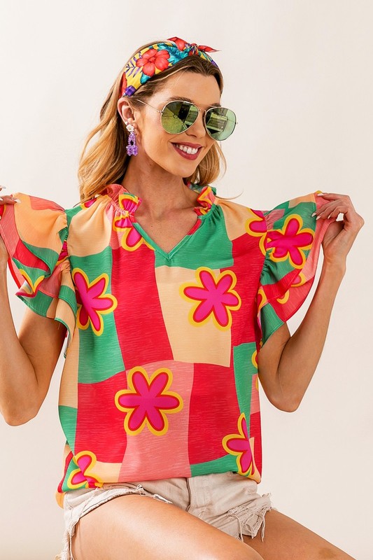Elevate your wardrobe with our Sammy Color Block Floral Ruffled Sleeve Top. Featuring a multi-color block design and delicate flower woven ruffled sleeves, this top adds a touch of whimsy to any outfit. Stand out from the crowd and express your unique style with this must-have top!